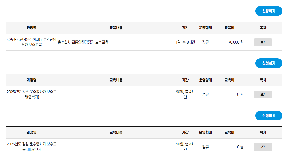 온라인 교육은 각 지역 교통연수원 또는 운수단체 홈페이지에서 신청할 수 있으며, 과정에 따라 회원가입이 필요할 수 있습니다.