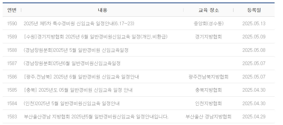 일반 경비원 신임교육은 취업의 필수 관문입니다. 교육기관은 지역마다 다양하게 분포되어 있으므로, 본인에게 가까운 곳을 찾아 일정에 맞게 신청하시는 것이 중요합니다. 빠르게 수료하고 안정적인 경비업무에 종사하시길 바랍니다.