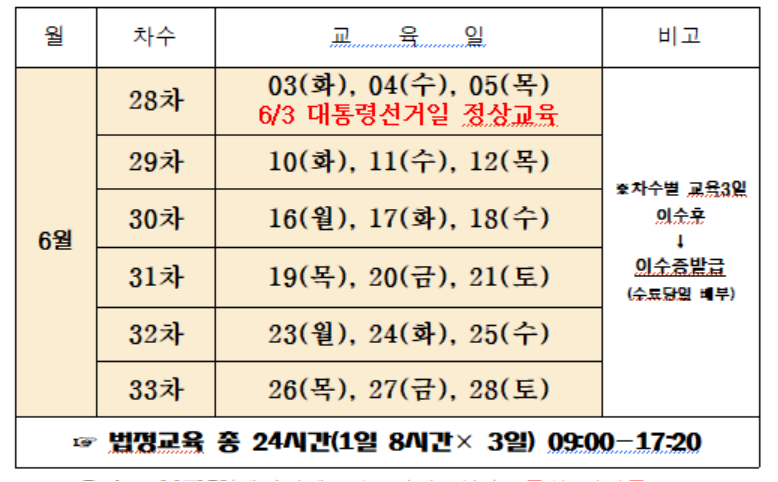 - 교육과목: 법정 교육과목(법률, 직무교육, 응급처치, 인권 등)