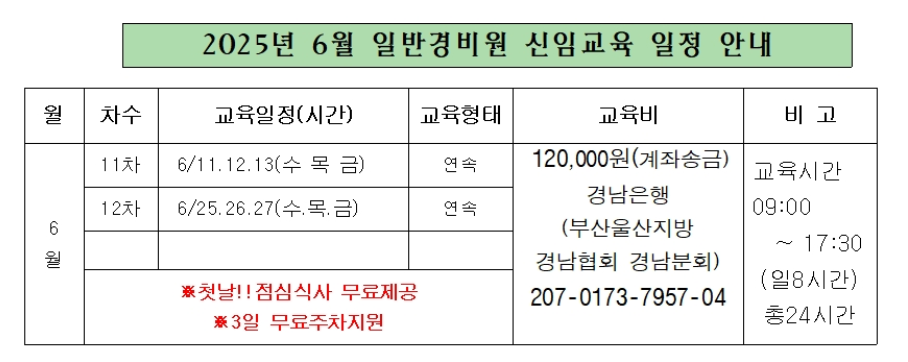 - 대상자: 경비원으로 처음 채용되는 자, 경비경력 3년 이상 경과된 자 등